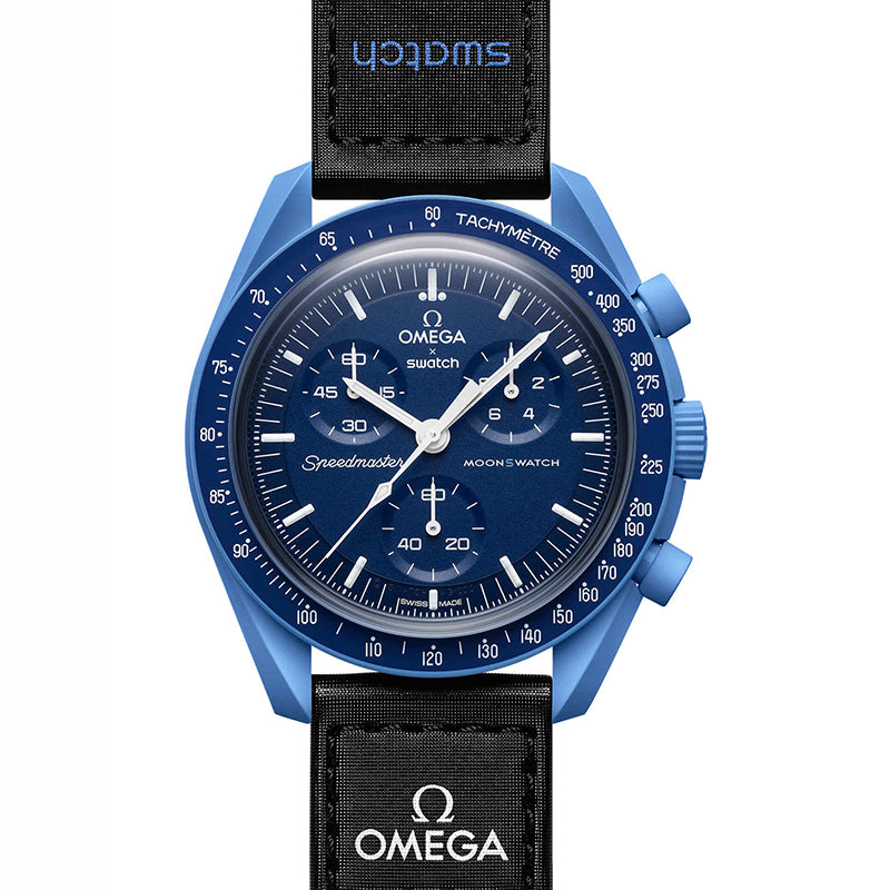 ディープネイビーブルーのトーンとブラックのVELCRO©ストラップの強烈な組み合わせ。ダーク好きのユーザーにはパーフェクトな時計です。コントラストを生み出すクロノグラフの秒針、サブダイアルの針、タキメーターの目盛はホワイト。 すべての文字盤には、OMEGA X SWATCHの文字、アイコニックなSpeedmasterのロゴ、そして新しいMoonSwatchのロゴが見られます。ガラス構造にはクリスタルの中央に隠れたSの字が統合。文字盤の外側のリングとサブダイアルには繊細で洗練された円の模様、シャープでスムーズなラグ構造、タキメーターの目盛が付いたベゼルにはアイコニックな「ドットオーバー90」のディテール、そしてもちろんユニークなBioceramicのタッチ。これらが全モデルに共通で、ディテールを愛する情熱を表わしています。すべての時針、分針、クロノグラフの秒針、そして時間のマーカーにスーパールミノバが施されているので、暗闇でパーフェクトに光ります。