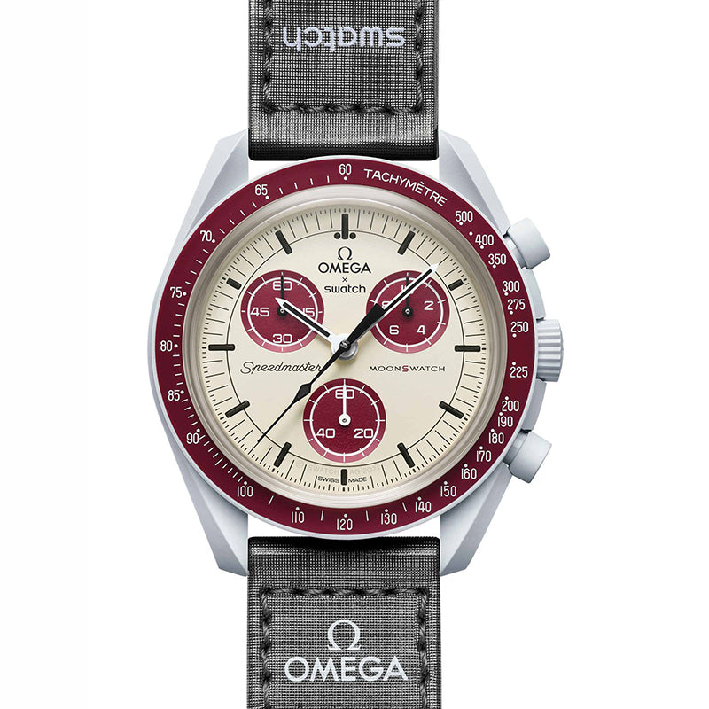 このモデルではライトなクールグレーのトーンがダークグレーのVELCRO©ストラップとコントラストをなしています。クロノグラフの秒針とサブダイアルの針はブラック。カウンターとベゼルの背景は2トーンのバーガンディ色です。 すべての文字盤には、OMEGA X SWATCHの文字、アイコニックなSpeedmasterのロゴ、そして新しいMoonSwatchのロゴが見られます。ガラス構造にはクリスタルの中央に隠れたSの字が統合。文字盤の外側のリングとサブダイアルには繊細で洗練された円の模様、シャープでスムーズなラグ構造、タキメーターの目盛が付いたベゼルにはアイコニックな「ドットオーバー90」のディテール、そしてもちろんユニークなBioceramicのタッチ。これらが全モデルに共通で、ディテールを愛する情熱を表わしています。すべての時針、分針、クロノグラフの秒針、そして時間のマーカーにスーパールミノバが施されているので、暗闇でパーフェクトに光ります。